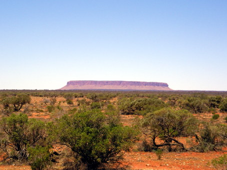 Outback (von Alice Springs via Uluru nach Adeleide) Den Abend in Alice Springs verbringen wir mit Christine aus Bayern. Mit ihr und ihren Freunden sind wir schon auf dem Weg nach Darwin für einige Tage gemeinsam durchs Outback gereist. Mittlerweile erhielt Christine einen Job in Alice Springs und flog kurz entschlossen dort hin. Und so treffen wir uns nun 4 Wochen später wieder. Die zweite Nacht im Roof-Tent ist schon angenehmer, und ein paar Bierchen am Vorabend haben wohl ebenfalls dazu beigetragen, dass wir besser schlafen. Am nächsten Morgen sind wir früh unterwegs, denn wir wollen bei Sonnenuntergang am Uluru sein, um das viel gepriesene Farbenspiel heute selbst zu erleben. Schon die 400 KM lange Fahrt ist sehr faszinierend, und der Sand und die Dünen werden zunehmend röter und röter. Ein sehr schöner Kontrast zu den oft sattgrünen Pflanzen und Büschen, die darauf wachsen. Zudem wird die Topographie hügeliger…nicht mehr ganz so flach wie die beiden Tage zuvor. Nach einigen Stunden Fahrt taucht in der Ferne plötzlich der Mt. Connor auf. Wie man uns erzählt, ebenfalls ein riesiger und sehr eindrucksvoller Monolith, (viel größer als der Uluru, doch nicht von solch spiritueller Bedeutung für die Aborigines). Dieses Foto ist aus ca. 8 KM Entfernung geschossen. Erst denken wir, es sei schon der Uluru, die Silhouette der uns vorliegenden Bilder verrät uns jedoch, dass er’s noch nicht ist.