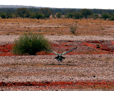 Den Sonnenaufgang am nächsten Morgen hätten wir gerne im Rahmen eines mehrstündigen Treks um den Uluru herum erlebt, doch unsere Zeitvorgaben hinsichtlich der Autorückgabe in Adelaide ließen das leider nicht zu. Und so machten wir uns, nach einem genüsslichen Frühstück bei idyllischem Fernblick auf den Uluru, wieder auf den Weg nach Osten, zurück zum Stewart Highway. Dieser Streckenabschnitt war geprägt von ganz besonderen Begegnungen mit großen Adlern. Aufgrund der dort überdurchschnittlich vielen des nachts überfahrenen Kängurus (Road Kill), präsentierte sich der Stewart Highway an diesem Morgen wie ein riesiges „Roo-Buffet“` für die Adler und andere Greifvögel. Die Adler sind die Könige unter ihnen, wenn sie kommen, machen alle anderen Platz. Aufgrund ihrer imposanten Grosse (stehend bis zu einem Meter hoch) und ihrer kräftigen Statur, können wir sie schon von weitem auf der Beute sitzend erkennen. Doch sie sind sehr scheu, so dass man sich für eine gute Nahaufnahme einiges einfallen lassen muss. Vorbeifahrende Autos bleiben scheinbar unbeachtet. Bei Tempo 40 können wir ca. 2m entfernt an ganzen speisenden Adler-Gruppen vorbeifahren und sie dabei sehr gut beobachten. Doch sobald wir das Tempo drosseln oder gar in weniger als 100m Entfernung anhalten, schauen sie sofort auf und haben uns fortan im Visier. Näher als 50 Meter lassen Sie uns nicht heran und fliegen davon. Da wir kein Teleobjektiv dabei haben, müssen wir für ein gescheites Foto jedoch näher dran und entscheiden uns deshalb fürs Fotografieren aus der Bewegung. Dali sitzt also am Steuer und fährt mit Tempo 30-40 auf die Adler zu, während ich auf dem Bullbar (Stahl-Kuhfaenger vor dem Kuehler) sitze und fotografiere. Nicht ganz einfach mit ner Pentax Optio SV. Sie macht zwar vergleichsweise gute Bilder, doch – wie bei allen Digitalkameras dieses Formats, sind die Auslöseverzögerungen ungeeignet für Schnappschüsse aus der Bewegung. Wie auch immer, einige Bilder sind uns so gelungen, wenngleich wir Euch hier leider nicht all das zeigen können, was wir glücklicherweise mit eigenen Augen sehen durften.
