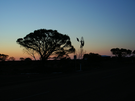 Am späten Nachmittag erreichen wir, bei sich langsam neigender Sonne die Flinders Ranges (eine idyllische Bergkette, die die von der Küste kommenden, voll gesogenen Regenwolken aufhält bis diese sich entleert haben, um das gesamte südwestlich von ihnen liegende Land fruchtbar zu machen). Von jetzt auf gleich verändert sich die seit tausenden Kilometern zumeist trockene Buschlandschaft in saftig grüne Wiesen und Hügel auf denen tausende von Kühen und Schafen grasen sowie in riesige Ackerflächen, die als die Obst-und Gemüsekammer Australiens bezeichnet werden, weil sie das gesamte Land ernähren.