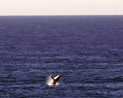 Besagtes Erlebnis: Nach einigen Stunden Fahrt durch grünes, hügeliges Weideland führt die Strasse aus den Bergen wieder hinab zur Küste, so dass wir schon aus weiter Ferne den Pazifik sehen können. Es ist ein sehr schöner sonniger Tag und das Meer ist relativ ruhig. Doch mitten im weiten Blau – recht nah vor der Küste – sehen wir in regelmäßigen Abständen immer wieder große, weiße Schaumkronen. Erst denken wir, es sei ein Riff, an dem sich hin wieder größere Wellen brechen. Doch dann stellen wir fest, die Schaumkronen „wandern“! Es ist kein Riff, es sind Wale! Wir fahren so schnell wir können weiter hinab zur Küste und als wir an einer Klippe (in Warnambool) das Meer erreichen, „schießt tatsächlich ein großer Humpback Wal – vielleicht 300m vor uns – aus dem Wasser…und dann wieder und wieder, so dass uns irgendwann sogar zwei gute Schnappschüsse gelingen. Mensch ist das ein tolles Erlebnis – wir koennen ihm bestimmt 20 Minuten lang zuschauen,