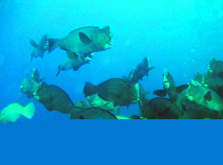 Es geht wieder früh los, und die See ist wieder rau. Doch diesmal war ich ja vorgewarnt und habe sowohl am Vorabend als auch am Morgen je eine Pille gegen Seekrankheit eingeworfen. Und das war auch gut so. Denn kaum sind wir aus dem Hafen raus, beginnt das gleiche Drama wie zuvor. Die Hälfte der Passagiere hängt wieder über der Reling, und ich bin heil froh, dass dieser Kelch heute an mir vorüber geht – die Pillen wirken. Diesmal dauert die Fahrt ans Riff ca. 3,5 Stunden und die meisten „Patienten“ sind bei der Ankunft so „platt“, dass sie den ersten Tauchgang gleich mal auslassen. Doch als wir vom Tauchen zurückkehren, geht’s der Mehrzahl schon wieder viel besser und es folgen 3 lustige Tage mit der bunt gemischten 16-köpfigen Truppe aus 6 verschiedenen Ländern. Auch das Tauchen ist insgesamt klasse und auch diesmal ist Sicht am Reef wieder spektakulär gut. Insbesondere die Morgen-Tauchgänge durch die farbenreichen Korallengärten, in denen sich um 7 Uhr bei aufgehender Sonne noch zahlreiche nachtaktive Fische tummeln, sind grandios. Insgesamt haben wir zwar größere Fisch-Schwärme erwartet, doch die faszinierenden Korallenformationen und die nie zuvor gesehenen individuellen Fische machen das wett. Das Highlight der gesamten Tour sind 40 grosse Bumphead-Parrots, die wir beim morgendlichen grasen an einem Pinnacle auf 16m Tiefe antreffen. zum Seitenanfang