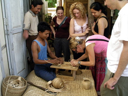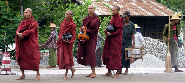Auf dem Inle Lake verbringen wir einen ganzen Tag - dieser Ausflug ist definitiv ein Highlight unserer bisherigen Reise. Wir besichtigen die schwimmenden Dör fer und Gärten, die auf dem See angelegt wurden. Die Gärten bestehen aus flachen schwimmenden Erdwällen und sind durch schmale Wasserwege voneinander abgegrenzt. So können die „See-Bauern“ die Gärten mit ihren Booten befahren. Hier wachsen alle möglichen Gemüsesorten, ein toller Anblick! Mittags rasten wir an einem schwimmenden Restaurant und genießen ein unerwartet gutes burmesisches Essen bei unglaublich schöner Aussicht auf den See. Wir sind begeistert. Vor allem die Herzlichkeit und Gastfreundschaft, mit der uns die Menschen überall begegnen, ist einzigartig. Nach dem Essen fahren wir zu einigen schwimmenden Manufakturen. So besuchen wir zum Beispiel eine Seidenfabrik und eine Zigarrenproduktion. Hier drehen und wickeln Frauen (und leider auch Kinder !!!!) Tabak und Charut-Blätter zu Zigarillos bzw. zu einer Art Zigarre. Der Grossteil wird in die Nachbarländer exportiert. Es werden keinerlei Maschinen eingesetzt. Alles ist pure Handarbeit. Natürlich kann man die Rauchwaren vor Ort auch kosten. Fazit: Sie schmecken exotisch und sind sehr günstig. 40 Stück dieser handgerollten Cigarettes kosten umgerechnet 40 Cent. Dies inspirierte die Männer unserer Gruppe gleich dazu, Businesspläne für den Export nach Europa und Amerika zu schmieden sowie eine geeignete Strategie zur Markteinführung der Burma-Zigarre zu entwickeln…