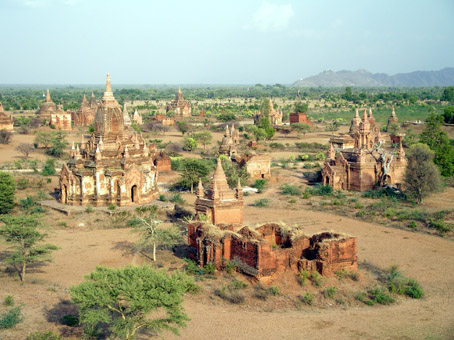 Über 5.000 Tempelruinen erstrecken sich über ein Areal von 36 Qkm. Erklimmt man das Dach großer zentral gelegener Stupas, kann man die steppenartige Tempellandschaft bis zu seinen 4 Grenztürmen in alle vier Himmelsrichtungen überblicken. So weit das Auge reicht – 1000ende von Tempeln. Ein faszinierendes Bild, dessen Anblick noch heute die Macht der damaligen burmesischen Herrscher ausstrahlt. Insbesondere bei Sonnenuntergang bietet sich uns ein unvergesslich beeindruckendes Panorama.
