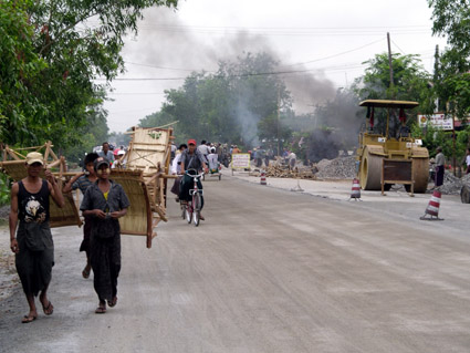 Die zweite Hälfte der Fahrt nach Bagan wird bedeutend rauer, denn nach Pyay verwandelt sich die Strasse in einen „besseren Feldweg“. 10 Stunden, bei 35 C ohne AC, über 400 KM im Schweinsgalopp! Diese Fahrt war trotz beeindruckender Landschaften oft nur schwer verdaulich. zurück zum Seitenanfang