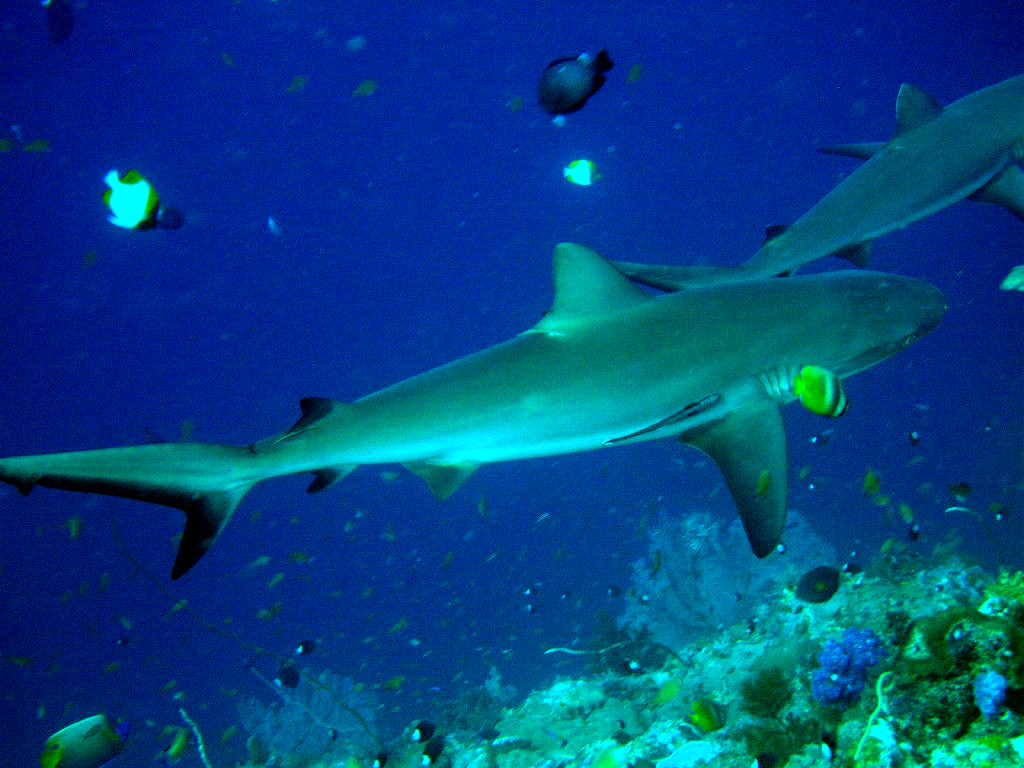 Den zweiten und dritten Tag unter Wasser verbringen wir an den legendären Tauchplätzen Blue Corner und German Channel (letzt genannter Tauchplatz hat seinen Namen erhalten, als die Deutschen gegen Ende des 19. Jahrhunderts eine Durchfahrt in das 30 Km vor Koror liegende Korallenriff sprengten, um mit grossen Marine-Schiffen direkt durchsegeln zu können. Heute aufgrund seiner nahrungsreichen Durch-Strömung ein einzigartiger Tauchplatz zur Beobachtung der eleganten Mantas, die dort Plankton ”filtern”..By the way: Haie (Black Tip, White Tip, Leopardenhaie und mit Glück auch Tiger-und Bull sharks) gibts insbesondere an diesen beiden Tauchplätzen so viele, dass man schon nach kurzer Zeit dazu neigt, vermehrt nach anderen Tieren zu suchen. Einfach ein Traum. Am Blue Corner haben wir auf einem Tauchgang über 40 Haie gezählt, teilweise 10 auf einmal. ... In Wirklichkeit sind die Farben natürlich viel reicher und eindrucksvoller. - Dennoch viel Spass beim Anschauen.