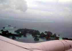 Die Flugzeit beträgt nur zwei Stunden. Neben uns sitzt zufällig Dermot Keane - der Geschäftsführer von Sam`s Dive Tours – er kehrt gerade heim von der BOOT. Mit Sam`s möchten wir auch tauchen. Eine gute Gelegenheit, die wichtigsten Palau-Tauchinfos zu erfragen und direkt einen guten Tauch-Deal zu vereinbaren. Nach knapp zwei Stunden Flugzeit sehen wir aus dem Flugzeug die einmaligen Felsformationen im Wasser - ein Labyrinth aus grünen Felsen. Leider regnet es, und der Blick ist trüb, trotzdem ist dieses Gefühl einmalig, die