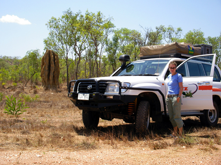 Outback (von Darwin nach Alice Springs) Am 5. Oktober holen wir früh morgens unseren Landcruiser mit 4,2 Liter Hubraum und Roof-Tent bei Britz Campervan Rentals ab und kehren auf den gut ausgebauten Stuart Highway zurück, diesmal gen Süden. Einen Teil dieses Highways, der das nördliche Darwin mit dem ganz im Süden liegenden Adelaide verbindet, sind wir schon auf dem Weg von Cairns nach Darwin gefahren (siehe Route), und die Landschaft ist uns noch sehr gut in Erinnerung. Insbesondere die im Norden über 3m hoch aus dem Boden ragenden Termitenhügel versetzen uns erneut ins Staunen. Die Architekten und Bauarbeiter dieser Türme sind nämlich