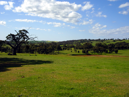 Am späten Nachmittag erreichen wir, bei sich langsam neigender Sonne die Flinders Ranges (eine idyllische Bergkette, die die von der Küste kommenden, voll gesogenen Regenwolken aufhält bis diese sich entleert haben, um das gesamte südwestlich von ihnen liegende Land fruchtbar zu machen). Von jetzt auf gleich verändert sich die seit tausenden Kilometern zumeist trockene Buschlandschaft in saftig grüne Wiesen und Hügel auf denen tausende von Kühen und Schafen grasen sowie in riesige Ackerflächen, die als die Obst-und Gemüsekammer Australiens bezeichnet werden, weil sie das gesamte Land ernähren.