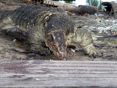 Eine tolle Überraschung war für uns die Zusammenkunft mit den dort wild lebenden Monitor-Lizards (Riesen-Varane). Nach unserem in Indonesien gestrichenen Komodo-Trip, hatten wir traurigerweise schon abgeschrieben, sie auf dieser Reise zu sehen. Und da wir absolut nichts von ihrer Existenz auf Tioman wussten, sind wir umso mehr erschrocken, als die urzeitlichen Drachen plötzlich ganz in unserer Nähe aus einem nahe liegenden Tümpel stiegen. Wir trauten unseren Augen kaum. Die meisten sind sehr scheu, und wenn sie sich beobachtet fühlen suchen sie schnell die Flucht. Deshalb war es anfangs schwierig, sie zu fotografieren. Mit der richtigen „Anschleichtechnik“ haben wir letztlich jedoch einige recht schöne Fotos von ihnen machen können.