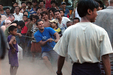 Nicht weit von Pyay entfernt kommen wir an einem Dorf vorbei, dessen Bewohner gerade den Geist des Regens beschwören. Ihm zu Ehren findet ein Tauziehen statt, das die Trockenzeit beenden und Regenwolken herbeirufen soll. Sobald wir aus dem Auto steigen, um das Spektakel aus der Distanz zu beobachten, stürmen einzelne Burmesen auf uns zu und fordern uns auf, ihre Mannschaft zu unterstützen. Ein großer Spaß und wohltuende körperliche Aktivität nach den vielen Stunden Autofahrt! Doch weil das Tauziehen im Staub stattfindet und unseren vollen Einsatz erfordert, sehen wir anschließend allesamt aus wie die Schweine. Egal. Der herzliche Jubel und die Freude der Burmesen über unsere Teilnahme machen alles wett. Sie lachen und tanzen mitten auf der Strasse und viele wollen uns (kräftige West-Menschen) einfach nur mal anfassen. Nach herzlichen Verabschiedungen steigen wir schließlich zurück in den Van und weiter geht’s nach Pyay. Kurz vor Erreichen der Stadt besichtigen wir noch die Shwemyetman Pagode, hier steht die einzige Buddhastatue der Welt, die eine Brille trägt. Eine eher lustig anmutende Erscheinung.