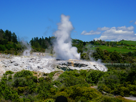 Rotorua Zurück aus der Fabelwelt, fahren wir weiter nach Rotorua – die Stadt der Geysire und thermischen Quellen. Von Rotorua