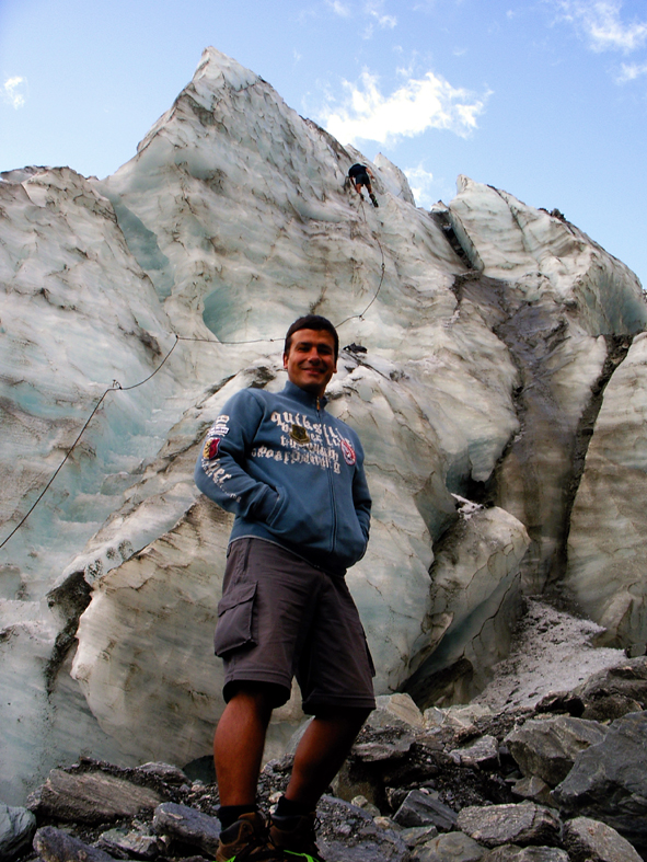 Am nächsten Morgen haben wir abermals großes Glück mit dem Wetter – Sonne und wolkenloser blauer Himmel - ideal für eine halbtägige Wanderung auf dem ewigen Eis des Franz-Joseph. Nachdem wir spezielle Ausrüstung erhalten haben (Spikes, warme Jacken, Handschuhe etc.), marschieren wir mit unserem Guide ca. 1 Stunde lang durch die kilometerlange Gletschermuräne, bis wir schließlich vor einer ca. 20m hohen fast vertikalen Eiswand stehen. Dort haben die Guides zwar einige Stufen hinein geschlagen, dennoch ist uns beim Blick nach oben allen etwas mulmig. Doch nun gibt’s kein zurück mehr. Wir schnallen die Spikes über die Boots und auf hinauf geht’s. Die gesamte Wanderung übers Eis dauert schlussendlich 3 Stunden und führt uns durch bizarre Eisformationen, über abgrundtiefe Gletscherspalten und durch farbenprächtige kleine Eishöhlen.
