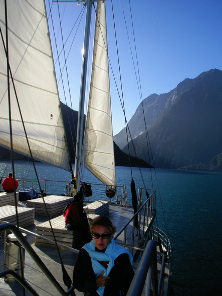 Schon die zweistündige Fahrt von Te Anau durchs Fiordland bis zum Milford Sound ist ein einziges panoramisches Spektakel (siehe Bilder). Am Sound angekommen, steigen wir direkt auf die Milford-Mariner – ein sehr schöner 3-Master auf dem wir bis morgen über den Milford Sound segeln werden. Nur auf dem Wasser kann man den Milford Sound mit seien zahllosen hinab stürzenden Wasserfällen und seinen gigantischen steilen, hunderte von Metern tief ins Meer ragenden Felswänden wirklich erleben.