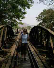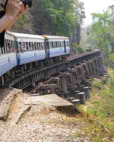 Für die Bahnbauarbeiten gab es (aufgrund des geringen Nachschubs) fast keine Werkzeuge. Sie wurden von ca. 300.000 Kriegsgefangenen und „versklavten“ Einheimischen verrichtet. Die Mehrzahl der Arbeiter starb an Hunger, Überarbeitung, Malaria und anderen Krankheiten. Wir sind 60km auf dieser Trasse gefahren. Es gibt auf der gesamten Strecke 688 Timber-Holz-Brücken (z.T. 30m hoch und 300m lang). Das Holz musste jeweils aus dem Dschungel geschlagen werden, und die Schluchten für Durchfahrten wurden bis zu 30m tief in den Fels gegraben…(18 Stunden Arbeit pro Tag, bei 42 Grad und kaum Wasser – auf den Memorial-Friedhöfen liegen über 60.000 Soldaten aus den USA, UK, Australien, Holland und weiteren Ländern Asiens). Der schlimmste Bauabschnitt waren die 4km am Hellfire-Pass (2 Zugstunden nordwestl. Von Kanchanaburi). Hier steht heute ein sehr schönes und informatives Museum zum Gedenken an die Opfer.